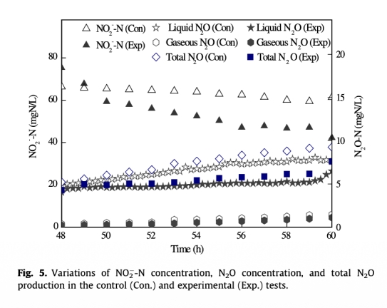5. 數(shù)據(jù)來自圖5:在48-60小時期間,F(xiàn)NA測試中N2O-N濃度為3.31 mg/L,低于對照的4.05 mg/L,且N2O生產(chǎn)因子在FNA測試中為9%,遠(yuǎn)低于對照的88%。研究意義是表明FNA預(yù)處理通過提供更多電子減少N2O積累,有助于溫室氣體減排。
