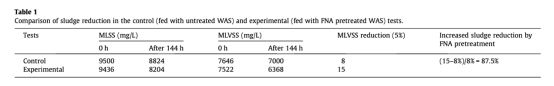 6. 數(shù)據(jù)來自表1:FNA測試中MLVSS減少率為15%,高于對照的8%。研究意義是證實FNA預(yù)處理能增強(qiáng)污泥減量,降低處理成本。