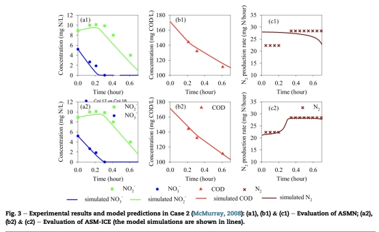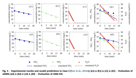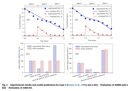 2 數據來自圖3:Case 2中測量了硝酸鹽、亞硝酸鹽、COD和氮氣的生產速率,例如硝酸鹽還原時亞硝酸鹽的積累和后續還原。研究意義是評估模型在真實活性污泥系統中的預測能力,ASM-ICE模型能更好地擬合氮氣生產動態,表明其適用于復雜廢水環境。