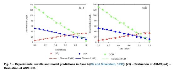 4 數據來自圖5:Case 4中測量了硝酸鹽還原、亞硝酸鹽積累和COD消耗,例如在低COD/N比條件下亞硝酸鹽的積累。研究意義是評估模型在碳源限制下的表現,兩種模型均能預測亞硝酸鹽積累,但ASM-ICE在更復雜條件下更可靠。