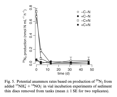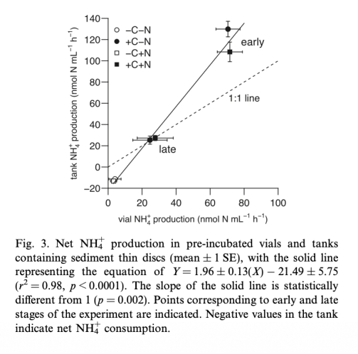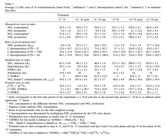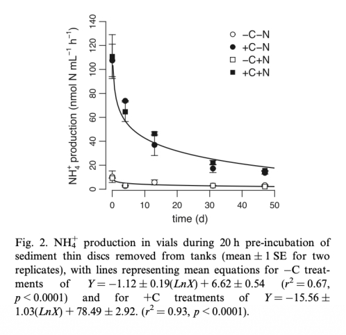 2 預培養小瓶中NH4生產速率數據,來自圖2和圖3。研究意義是評估有機碳分解速率,作為電子供體供應的代理,鏈接到DNRA和N2生產的分配。