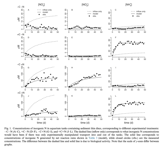 1 坦克中無機氮濃度變化數據,包括NH4、NO3和NO2濃度,來自圖1。研究意義是直接反映沉積物中氮轉化動態,顯示NO2積累或消耗指示反硝化和DNRA活性,幫助識別過程主導因素。