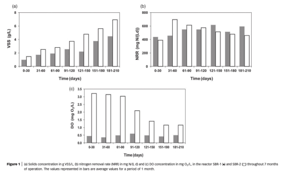1 數據來自圖1:測量了生物量濃度(VSS)、氮去除率(NRR)和DO濃度隨時間變化。例如,SBR-1生物量從1.0 g VSS/L增至4.5 g VSS/L,SBR-2從0.7 g VSS/L增至7.0 g VSS/L,NRR均達0.6 g N/(L·d)。研究意義是顯示不同DO下生物量積累和氮去除效率相似,但生物量形態差異顯著,表明DO影響顆?;腔救コ芰?。