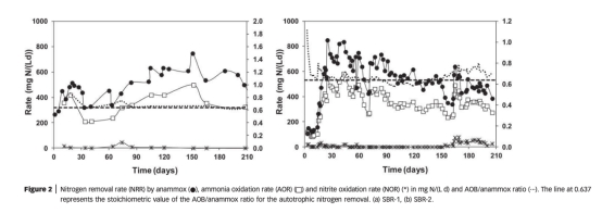 2 數據來自圖2:測量了anammox氮去除率、氨氧化率、亞硝酸鹽氧化率及AOB/anammox比率。例如,SBR-2的AOB/anammox比率接近理想值0.637。研究意義是驗證DO能調節AOB和anammox活性平衡,高DO促進AOB生長,從而優化工藝 stoichiometry。