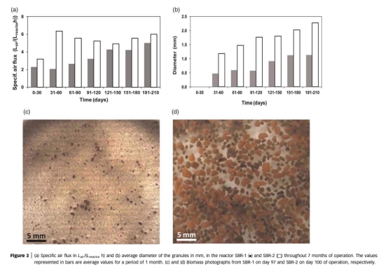 3 數據來自圖3:測量了比空氣通量和顆粒平均直徑。SBR-2顆粒直徑達2.3 mm,而SBR-1為1.1 mm。研究意義是表明高DO促進大顆粒形成,增強沉降性,提高系統穩定性。