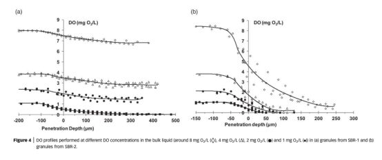4 數據來自圖4:通過氧微剖面測量顆粒內部氧滲透深度。SBR-1顆粒在低DO(1 mg O2/L)下氧滲透150μm,SBR-2顆粒需高DO(8 mg O2/L)才完全滲透。研究意義是揭示DO控制顆粒內部好氧/缺氧區分布,影響AOB和anammox空間定位,從而決定工藝魯棒性。