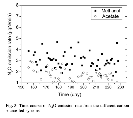 2. N2O排放率:測量了從好氧罐排放的N2O氣體速率,數據來自圖3。研究意義是直接比較碳源對N2O排放的影響,表明乙酸鈉系統排放更低,有助于評估碳源在減少溫室氣體排放方面的潛力。