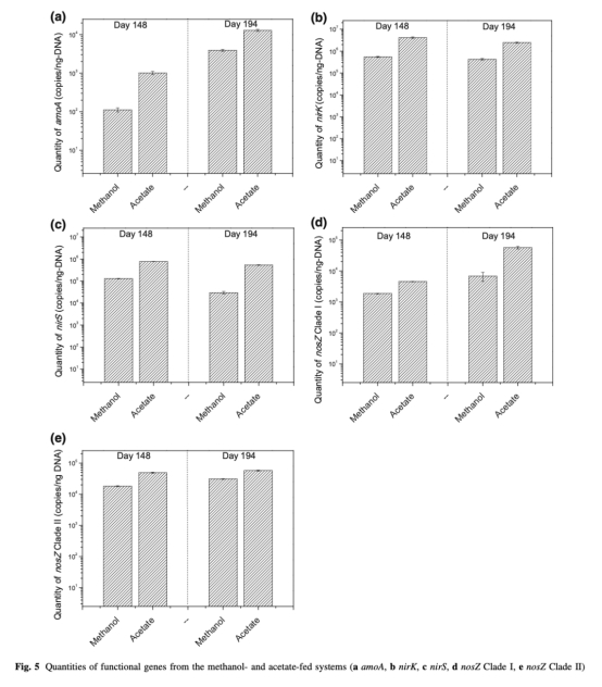 4. 功能基因豐度:量化了amoA、nirK、nirS、nosZ Clade I和nosZ Clade II基因的拷貝數,數據來自圖5。研究意義是評估碳源對氮轉化酶基因的影響,乙酸鈉系統有更高的nosZ基因豐度,表明更強的N2O還原能力。