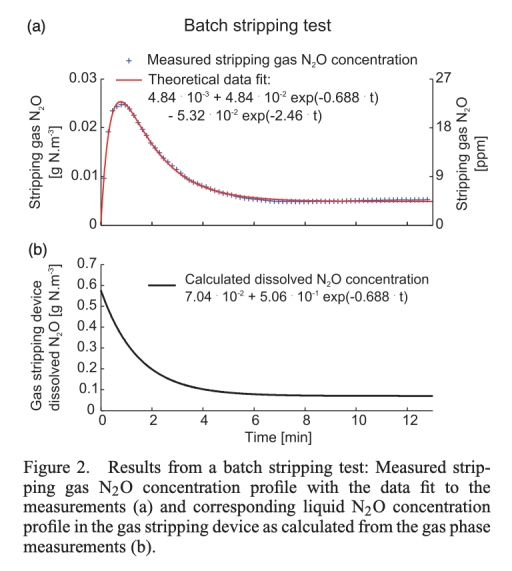1. 批次吹脫測試的氣體N2O濃度剖面和液體N2O濃度剖面,數據來自圖2。研究意義:通過測量吹脫氣體濃度(圖2a)和計算液體濃度(圖2b),驗證了裝置的動力學模型,確定了時間常數(如τ_stripping=1.45 min)和kLa值(0.712 min?1),證明了方法能夠準確反映溶解N2O的 stripping 過程,并為后續連續監測提供校準基礎。