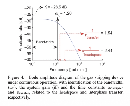 3. 氣體吹脫裝置的Bode振幅圖,數據來自圖4。研究意義:Bode圖(圖4)評估了裝置的頻率響應,確定了帶寬(ω_c=1.20 rad min?1)和系統增益(K=-28.5 dB),表明裝置能夠捕捉分鐘級時間尺度的變化,檢測限為0.03 g N m?3,這為方法在常規活性污泥系統中的適用性提供了依據,并指導了設計優化。