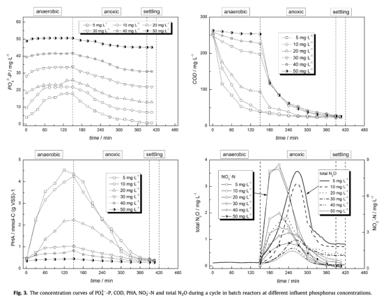 研究思路包括在實驗室規模的厭氧/缺氧SBR中培養DPAOs,運行超過90個周期以穩定反應器性能。然后進行連續實驗,在不同進水磷濃度(5、10、20、30、40和50 mg/L)下測量化學需氧量(COD)、磷化合物、PHA、糖原和N2O濃度等參數,使用動力學模型分析污泥行為,并比較改進進料方式(連續添加磷和硝酸鹽)的效果。數據分析結合統計方法,以揭示進水磷濃度的影響機制。