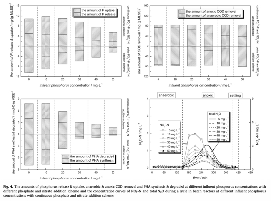 4 改進進料方式下磷吸收、COD去除、PHA合成和N2O數據,來自圖4。研究意義是顯示連續添加磷和硝酸鹽能增強厭氧PHA合成(如20 mg/L時從1.76增至3.03 mmol-C/gVSS)和磷去除,并抑制N2O生產(低至0.01 mg/L),為實際工程中優化操作提供依據。