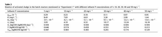 5 動力學參數數據,如最大比降解速率(qmax)和表觀半速率常數(K),來自表2。研究意義是通過Monod動力學模型量化污泥行為,顯示進水磷濃度增加時qmax和K下降(如qmax從0.29降至0.05 h-1),表明高磷濃度抑制DPAOs代謝,支持磷濃度對過程性能的負面影響。