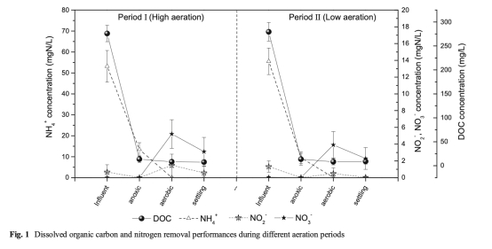 1 水質參數數據,如DOC和DTN去除效率,來自圖1。研究意義是評估系統性能,顯示在高和低曝氣期間DOC和DTN去除效率均高于90%,表明甘油作為碳源能有效支持氮去除,為N2O排放分析提供基礎。