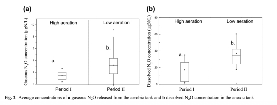 2 N2O濃度數據,包括好氧罐氣體N2O濃度和缺氧罐溶解N2O濃度,來自圖2。研究意義是直接量化N2O排放水平,顯示低曝氣增加N2O濃度,揭示曝氣速率對排放的負面影響,指導操作優化。
