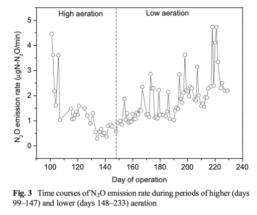 3 N2O排放速率時間過程數據,來自圖3。研究意義是跟蹤N2O動態變化,表明低曝氣期間排放速率更高,關聯到過程穩定性,支持時間序列分析。