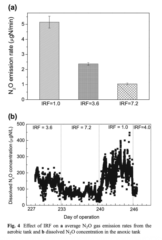 4 內部回流比影響數據,如N2O排放速率和溶解N2O濃度在不同IRF下的變化,來自圖4。研究意義是證明高IRF比減少N2O排放,表明回流比調控能促進N2O還原,為工程參數設置提供依據。