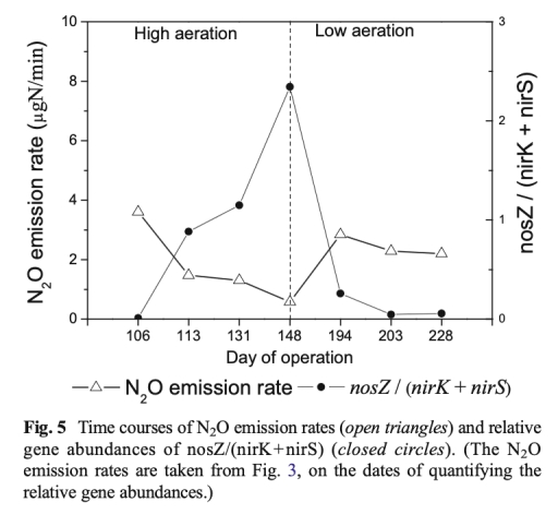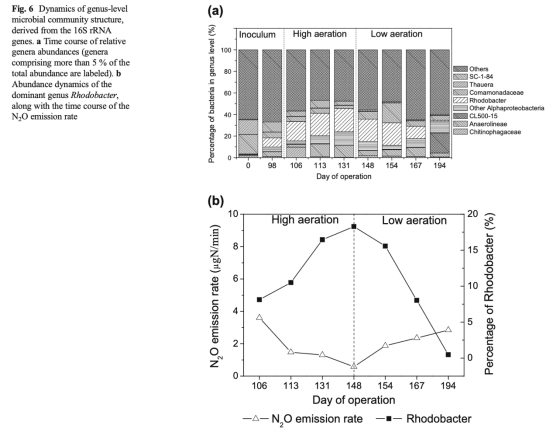 6 微生物群落結構數據,如Rhodobacter相對豐度,來自圖6。研究意義是識別關鍵N2O還原菌,顯示Rhodobacter在高曝氣期間占主導,解釋群落動態對排放的影響。