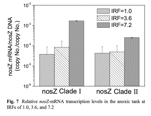 7 mRNA轉錄水平數據,如nosZ基因轉錄在不同IRF下的變化,來自圖7。研究意義是評估N2O還原活性,顯示高IRF增加轉錄水平,證實操作參數對微生物代謝的調控。