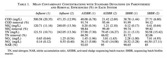 1 NH4-N、NO2-N、NO3-N、TN和COD的濃度變化數據,來自圖2和圖3。研究意義是評估反應器的氮去除性能和亞硝化效率,顯示SBBR的TN去除更高,表明生物膜系統具有更好的同步硝化反硝化能力,為優化工藝提供依據。