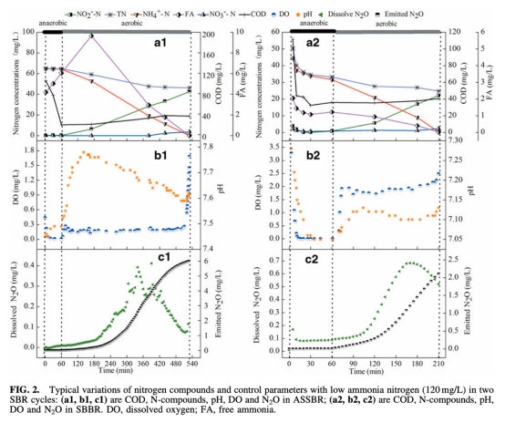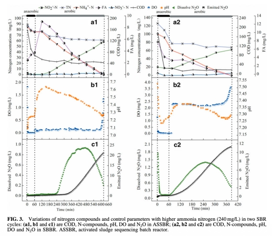 5 pH、DO和游離氨(FA)濃度數據,來自圖2和圖3。研究意義是關聯環境條件與N2O排放,低DO和高FA促進亞硝化但增加N2O風險,為過程控制提供指導。