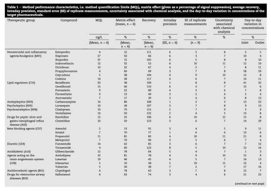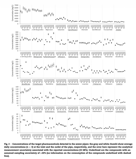 1 藥品濃度數據,包括43種藥品和2種布洛芬代謝物在入口和出口的每日平均濃度,來自圖2。研究意義是直接量化藥品在下水道中的存在和變化,顯示大多數化合物濃度穩定,為污水流行病學提供基線數據,并揭示個別化合物如磺胺甲惡唑的負去除可能指示結合物轉化。