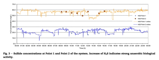 2 硫化物濃度數據,顯示入口和出口的H2S濃度變化,來自圖3。研究意義是驗證下水道厭氧微生物活動,硫化物增加表明生物膜活性,支持藥品轉化可能由微生物過程驅動。