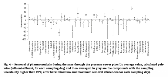 2 部分藥品如地爾硫卓、西酞普蘭等顯示顯著去除(25-60%),而磺胺甲惡唑和厄貝沙坦顯示負去除(濃度增加),可能由于結合物轉化回母體化合物。