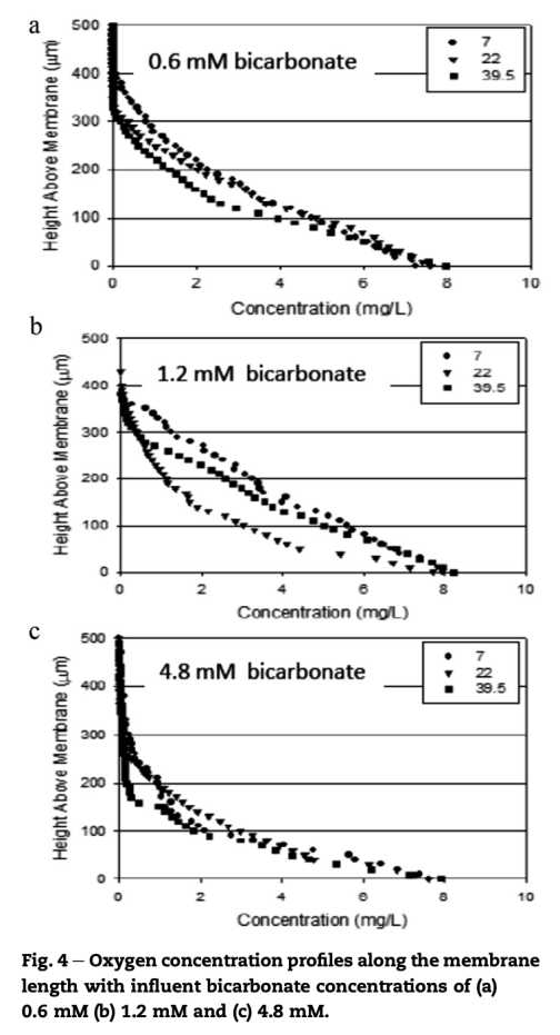 研究思路包括在實驗室規(guī)模MABR中培養(yǎng)硝化生物膜,使用平片微孔膜作為支持介質(zhì)。通過改變進水碳酸氫鹽濃度(0.6、1.2和4.8 mM)、水力停留時間(24小時和12小時)和膜內(nèi)氧分壓(0.21 atm和0.4 atm)來操作反應(yīng)器。使用屏蔽微電極(包括丹麥Unisense的溶解氧微電極和自制的銨、硝酸鹽、pH微電極)測量生物膜內(nèi)的濃度剖面。同時,開發(fā)并校準(zhǔn)一個一維生物膜模型,該模型結(jié)合酸堿平衡和二氧化碳 stripping 效應(yīng),預(yù)測局部pH和物種濃度。模型與實驗數(shù)據(jù)比較,以驗證其準(zhǔn)確性,并分析參數(shù)如生物膜密度和有效擴散系數(shù)。