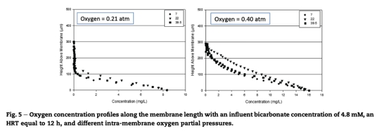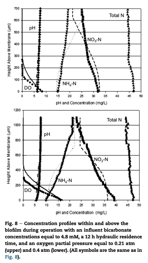 2 膜曝氣生物膜比傳統(tǒng)生物膜更易出現(xiàn)pH下降,因為硝化發(fā)生在生物膜深層,堿度擴散受阻,導(dǎo)致局部酸性條件抑制硝化。
