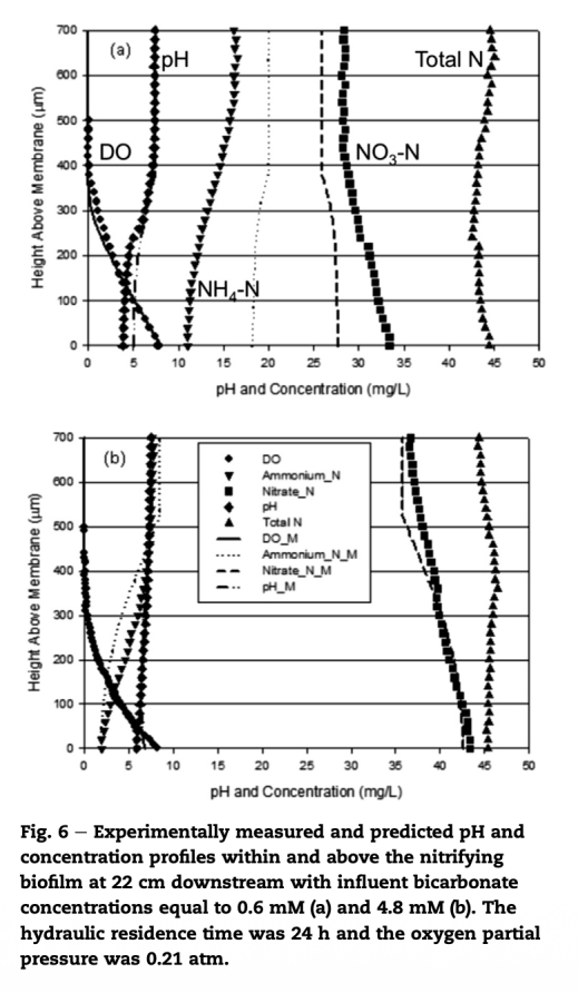 論文摘要闡述了在實驗室規(guī)模膜曝氣生物反應(yīng)器(MABR)中培養(yǎng)硝化生物膜,用于校準(zhǔn)和測試一個一維生物膜模型,該模型結(jié)合化學(xué)平衡計算局部pH值。通過屏蔽微電極測量了實際操作條件下生物膜及邊界層中的溶解氧、銨、硝酸鹽和pH濃度剖面。操作條件變化包括堿度(碳酸氫鹽負荷)、銨負荷和膜內(nèi)氧分壓。硝化性能在測試范圍內(nèi)隨銨和碳酸氫鹽負荷增加而改善,但隨膜內(nèi)氧分壓增加而下降。模型預(yù)測與實驗結(jié)果基本一致,突出了在低堿度水中生物膜內(nèi)pH變化的重要性,表明進水pH和緩沖能力可能顯著影響MABR的硝化性能。