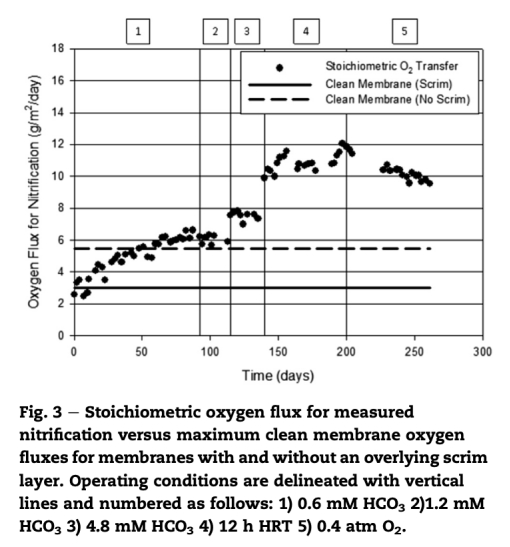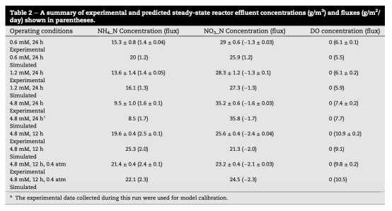 2 反應(yīng)器性能數(shù)據(jù),包括銨和硝酸鹽的 effluent 濃度和通量,來自表2。這些數(shù)據(jù)通過質(zhì)量平衡計算,顯示硝化效率隨堿度增加而提高(如堿度從0.6 mM增至4.8 mM時,硝化率從55%升至79%)。研究意義在于量化操作條件對整體反應(yīng)器性能的影響,為MABR設(shè)計提供實踐指導(dǎo),如優(yōu)化堿度負荷以增強硝化。
