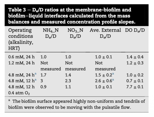 3 有效擴散系數(shù)(De/D)數(shù)據(jù),來自表3,通過濃度梯度計算。數(shù)據(jù)顯示在生物膜不同區(qū)域擴散系數(shù)變化,例如在外部區(qū)域De/D大于1,表明對流傳輸增強。研究意義在于揭示生物膜結(jié)構(gòu)異質(zhì)性對質(zhì)量傳遞的影響,指出模型假設(shè)均勻擴散的局限性,并建議未來模型需納入空間變異。