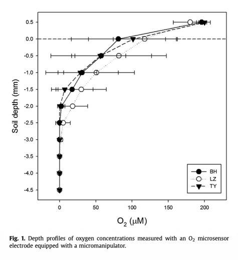 5 溶解氧濃度剖面數(shù)據(jù),使用Unisense電極測(cè)量,來(lái)自Fig.1。研究意義在于直接證實(shí)深層土壤的厭氧條件,解釋anammox活性隨深度增加的機(jī)制,強(qiáng)調(diào)氧氣可用性的關(guān)鍵作用。
