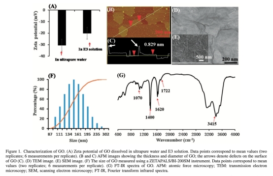 1. GO表征數(shù)據(jù):包括Zeta電位、AFM顯示的厚度(0.8-1 nm)、尺寸分布(101-258 nm)、FT-IR顯示的官能團(tuán)(如-OH、C=O)。研究意義在于確認(rèn)GO的物理化學(xué)性質(zhì),為后續(xù)毒性機(jī)制提供基礎(chǔ)。數(shù)據(jù)來自圖1。