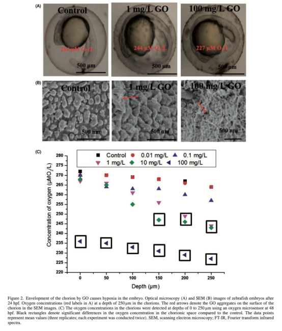 2. GO包裹絨毛膜和缺氧微環(huán)境數(shù)據(jù):SEM顯示GO覆蓋絨毛膜表面并阻塞孔道(圖2B);FT-IR顯示絨毛膜官能團(tuán)變化(如C-OH增加);Unisense氧微傳感器測量顯示,隨GO濃度增加(1-100 mg/L),絨毛膜附近氧濃度顯著降低(如100 mg/L時(shí)從271 μM降至227 μM)。研究意義在于證明GO包裹導(dǎo)致物理性缺氧,是孵化延遲和發(fā)育異常的直接原因。數(shù)據(jù)來自圖2A、2B、2C。