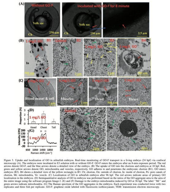 3. GO攝取和線粒體損傷數(shù)據(jù):激光共聚焦顯微鏡顯示GO-F在8分鐘內(nèi)進(jìn)入胚胎,主要定位于卵黃囊(圖3A);TEM顯示GO通過內(nèi)吞作用進(jìn)入胚胎,損傷線粒體(膜腫脹)(圖3B、3E、3F);拉曼光譜證實(shí)胚胎內(nèi)GO聚集(圖3G)。研究意義在于揭示GO能穿透生物屏障,通過內(nèi)吞途徑引起細(xì)胞器損傷,為氧化應(yīng)激提供機(jī)制解釋。數(shù)據(jù)來自圖3A-G。