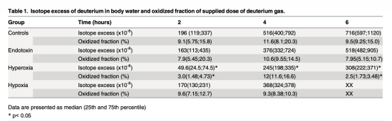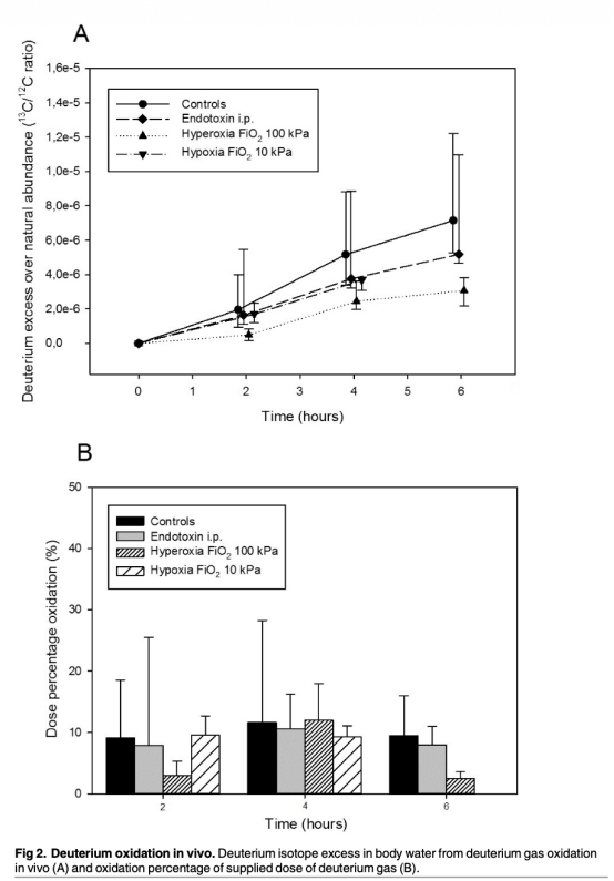 1. 體內氘氧化率:通過測定體水中的氘同位素過剩(來自Table 1和Fig 2),顯示在生理條件下,約10%的氘被氧化。高氧組氧化率顯著降低,而缺氧和炎癥組無顯著變化。研究意義在于首次定量證明了氫在體內被氧化,支持其作為抗氧化劑的角色,并表明氧化率受環境氧濃度影響,可能涉及鐵介導的機制。數據來自Table 1和Fig 2。