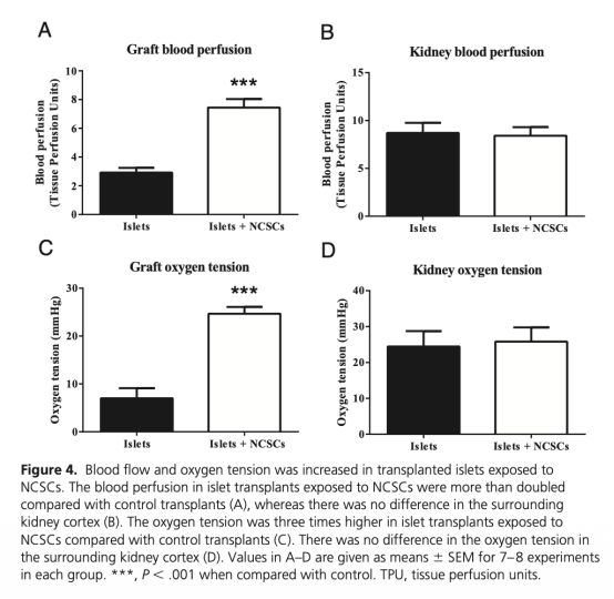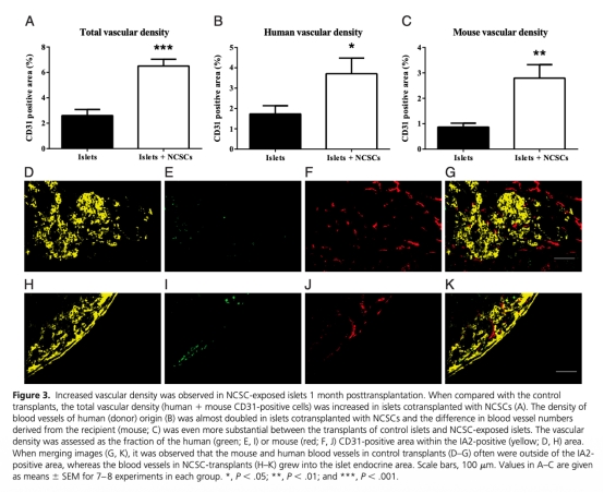 3 血管密度數(shù)據(jù):NCSCs暴露組血管密度(CD31標(biāo)記)顯著增加,包括供體來源和受體來源血管(圖3)。研究意義:表明NCSCs促進血管生成,改善胰島血液供應(yīng),有助于移植胰島存活和功能。