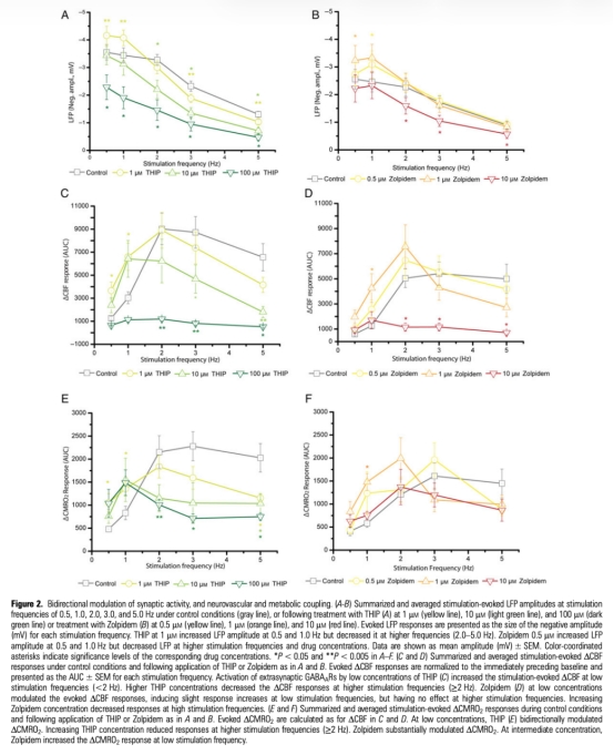 2 腦血流變化(ΔCBF)數(shù)據(jù):低濃度THIP(1μM)在0.5-1.0 Hz刺激下增加ΔCBF,高濃度(10-100μM)在2.0-5.0 Hz下抑制;Zolpidem類似但效應弱。研究意義顯示GABA能信號可放大低頻輸入的血管反應,抑制高頻輸入,可能優(yōu)化能量供應。數(shù)據(jù)來自Figure 2C和2D。