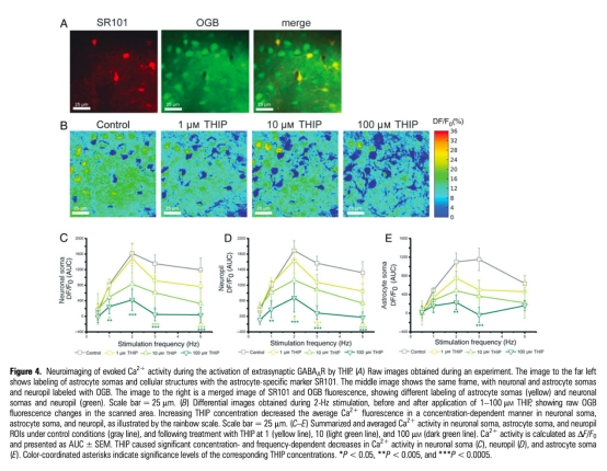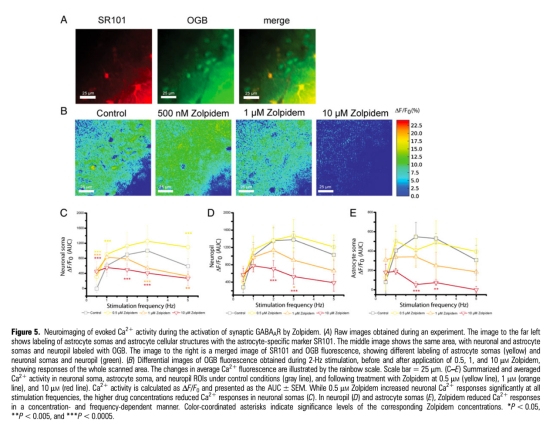4 胞內Ca2+瞬變數(shù)據(jù):THIP濃度依賴性地抑制神經(jīng)元胞體、神經(jīng)氈和星形膠質細胞Ca2+響應;Zolpidem低濃度增加神經(jīng)元胞體Ca2+,高濃度抑制。研究意義提示Ca2+信號介導GABA能調節(jié)的神經(jīng)血管耦合,突觸和突觸外受體作用不同。數(shù)據(jù)來自Figure 4和Figure 5。