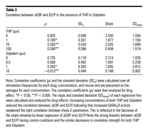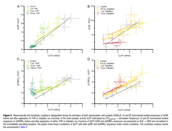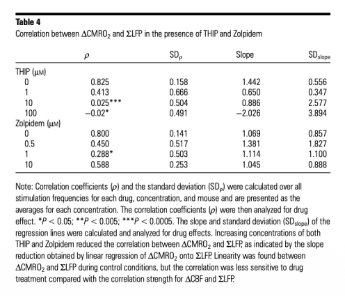 5 神經(jīng)血管耦合相關性數(shù)據(jù):ΔCBF和ΔCMRO2與總突觸活動(ΣLFP)在對照條件下線性相關,但THIP和Zolpidem濃度增加削弱這種相關性。研究意義表明GABA能活動可解耦突觸活動與血流/代謝響應,影響B(tài)OLD信號解讀。數(shù)據(jù)來自Figure 3和Table 3、Table 4。