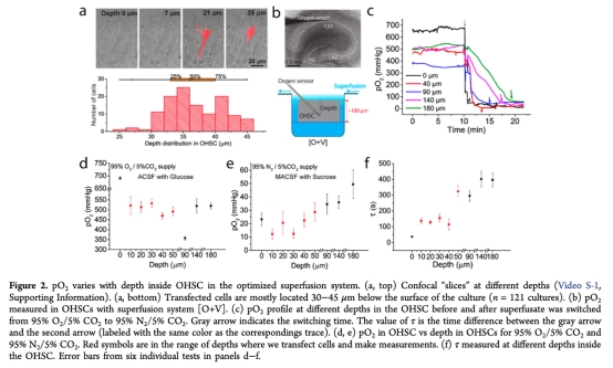 2. 測量了pO2隨OHSC深度的變化(圖2),研究意義是確定了轉(zhuǎn)染細(xì)胞所在深度范圍(30-45μm)的pO2可控且一致,為單神經(jīng)元測量提供了可重復(fù)的環(huán)境。
