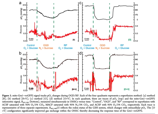 3. 測量了mito-Grx1-roGFP2信號與pO2變化的同步性(圖3),研究意義是證實了傳感器能快速響應(yīng)OGD/RP過程中的氧化還原變化,驗證了方法的實時性。