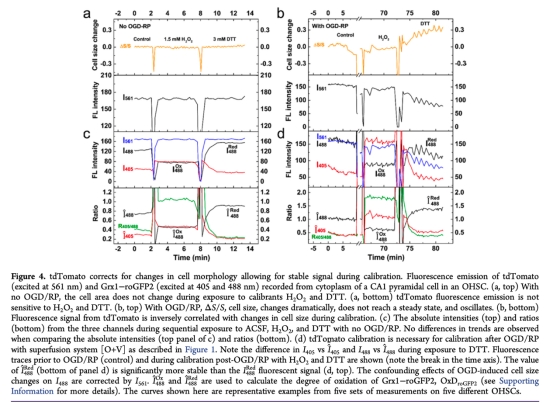 4. 測量了tdTomato作為內(nèi)部標(biāo)準(zhǔn)校準(zhǔn)Grx1-roGFP2的效果(圖4),研究意義是解決了OGD/RP后細(xì)胞形態(tài)變化對熒光信號的干擾,使氧化還原參數(shù)(如OxDroGFP2)的定量更準(zhǔn)確。