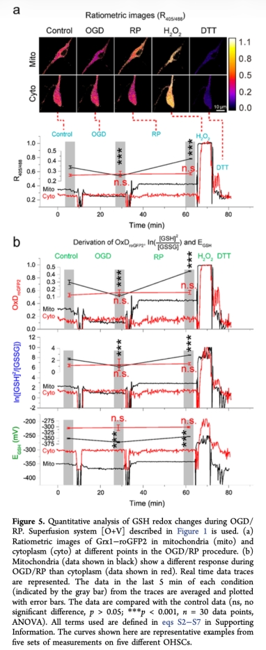 5. 測量了線粒體和細(xì)胞質(zhì)中GSH氧化還原狀態(tài)在OGD/RP過程中的變化(圖5),研究意義是揭示了線粒體GSH系統(tǒng)在OGD期間更還原、RP期間更氧化的動態(tài)變化,而細(xì)胞質(zhì)無顯著變化,表明線粒體對氧化應(yīng)激更敏感,為理解腦卒中機制提供了新見解。