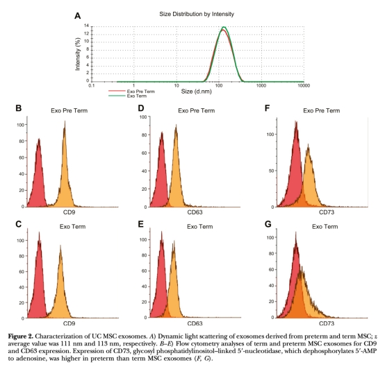1. 外泌體大小和標記物表達數據:通過動態光散射和流式細胞術測量,顯示外泌體直徑約為100-120納米,并表達CD9、CD63等標記物,但早產外泌體的CD73表達更高。研究意義是確認外泌體的純度和特性,表明早產外泌體可能具有不同的酶活性,數據來自圖2。
