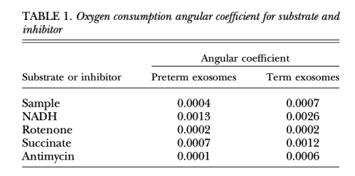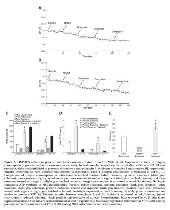 2. 氧消耗速率數據:使用丹麥Unisense電極測量,顯示外泌體在NADH和琥珀酸存在下消耗氧氣,足月外泌體的氧消耗速率高于早產外泌體,且能被魚藤酮和抗霉素A抑制。研究意義是證明外泌體具有功能性的電子傳遞鏈,支持其線粒體外有氧呼吸能力,數據來自圖3和表1。