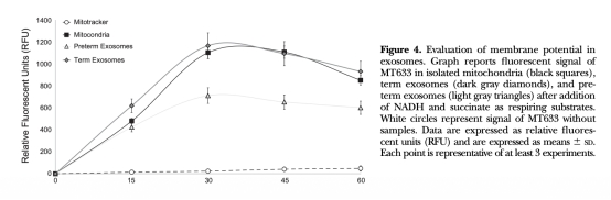 4. 膜電位數據:使用Mitotracker 633測量,顯示外泌體具有膜電位,足月外泌體與線粒體相似,而早產外泌體較低。研究意義是證實呼吸鏈產生質子梯度,支持氧化磷酸化的功能性,數據來自圖4。