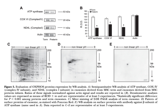 5. 蛋白質表達數據:通過Western blot分析,顯示外泌體表達復合物I、IV和ATP合酶亞基,足月外泌體表達更高。研究意義是證明外泌體含有與線粒體相似的呼吸鏈蛋白,支持其代謝功能,數據來自圖5。
